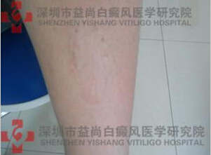 ▲病史:患者于1年前无明显诱因左小腿出现白斑,曾于外院医院治疗,用外用药(具体不详),口服药(具体不详),治疗效果不佳,白斑继续扩散,今日特来我院就诊。
