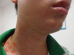 今年27岁的小郭,是土生土长的香港人,但是到现在小郭都还没有谈过恋爱,就是因为在17岁那年,小郭发现自己脸部和颈部无端长出了很多白斑。而且小郭颈部的白斑扩散速度非常快,不到两个月的时间,白斑面积已经接近手掌大小,父母也为此找了一些所谓的“神医”,开了一些“包治百病”偏方。但是不但没有效果,还扩散了。后来,绝望的小郭就放弃了治疗,全心的投入学习当中,借此来忘记脸上白斑的困扰。