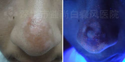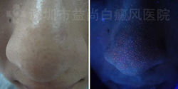 1、伍德灯检测:鼻部有不同程度的色素脱失。