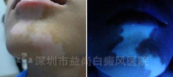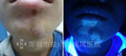 1、伍德灯检测:面部有不同程度的色素脱失。