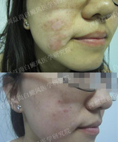 初次就诊时,患者面部白斑仍在扩散,且速度较快。检查结果显示其面部白斑处黑色素缺失严重...[详情]