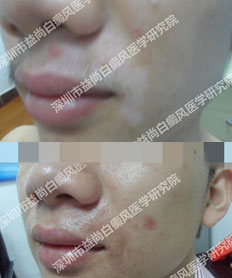 初诊时,面部嘴唇部位白斑较明显,黑色素缺失叫严重。首先针对该患者情况,...[详情]