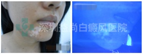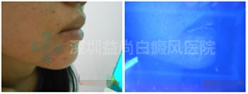 (初诊,小颖的下巴白斑在wood灯下显示明显,色素脱失严重)