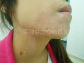 (治疗不到4个月,患者下颌及颈部的白斑已消退明显,并进入稳步的康复期)