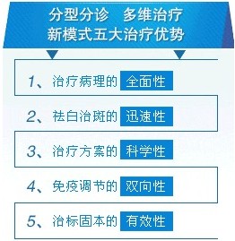 临床研究证实:单一疗法是不可能治愈白癜风的,治疗白癜风必须多手段、全方位进行。“分型分诊·多维治疗”。从评估到检查、治疗、监控再到愈后养护、监控管理,充分尊重患者的个体特性,打破传统“千人一方”的弊端,真正意义上满足白癜风患者的治疗需求和临床康复。