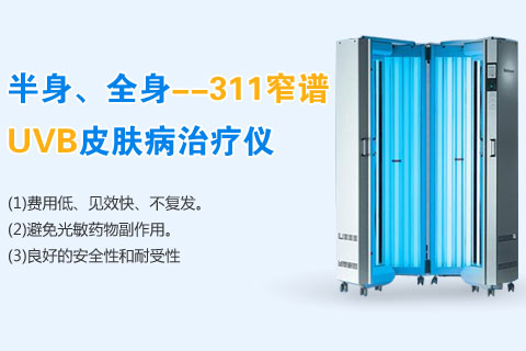 311nm窄谱UVB的出现,使大幅度提高照射强度、缩短治疗时间的安全照射成为现实,大大提高了各类皮肤病的治疗效果。如近年来研究发现<295nm UVB无抗牛皮癣的作用,而300—313nm的UVB具有最佳的抗牛皮癣活性作用,临床实践表明311nm窄谱UVB的疗效优于传统光疗; 311窄谱uvb也是一种新的治疗白癜风方法,患者皮损经过光疗后可使皮肤中的酪氨酸酶活性增加,促使黑素细胞合成增多,从而达到治愈的目的;国际医学界一致认为:311窄谱uvb对银屑病、白癜风、玫瑰糠疹、带状疱疹、湿疹、皮炎、掌跖脓疱病等各类皮肤顽症见效快、总有效率高、愈后不易复发等优点。在临床实践中我们还发现,应用311窄谱UVB治疗前,如结合汽疗或药浴疗法会取得更好的治疗效果。